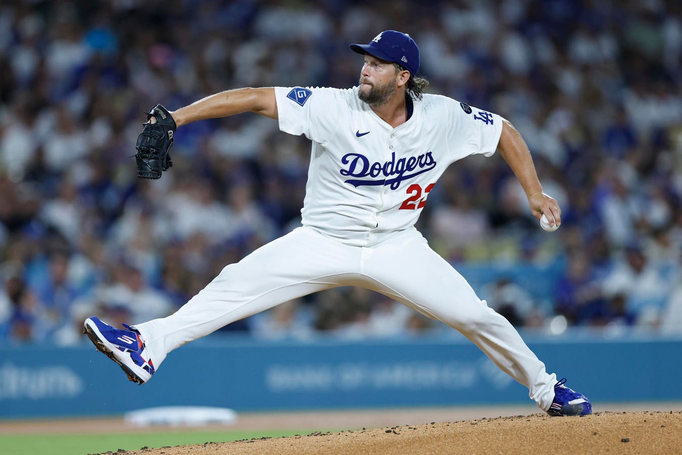 LOS ANGELES, CALIFORNIA – SEPTEMBER 19: Clayton Kershaw #22 of the Los Angeles Dodgers throws a pitch against the San Francisco Giants during the first inning at Dodger Stadium on September 19, 2025 in Los Angeles, California. (Photo by Ronald Martinez/Getty Images)