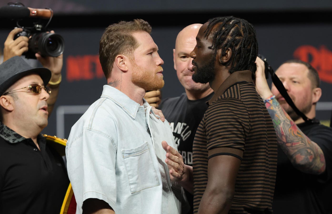 LAS VEGAS, NEVADA – JUNE 27: Undisputed super middleweight champion Canelo Alvarez (L) and Terence Crawford face off during a news conference at T-Mobile Arena on June 27, 2025 in Las Vegas, Nevada. Alvarez is scheduled to defend his titles against Crawford on September 13, 2025, at Allegiant Stadium in Las Vegas. (Photo by Steve Marcus/Getty Images)