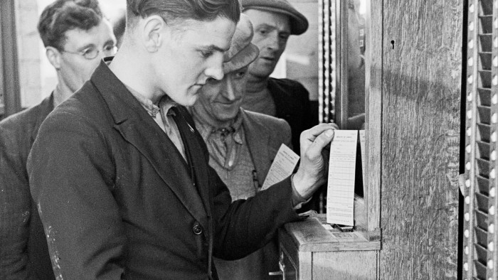 1930s sawmill workers clock in to work at a paper mill in south Wales, using a Gledhill-Brook Time Recorder © Allan Cash Picture Library/Alamy