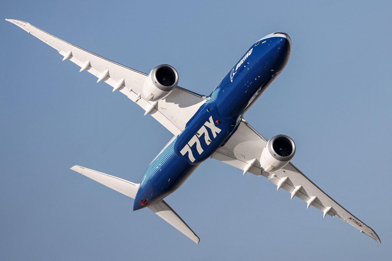 A Boeing 777X aircraft performs a demonstration flight at the 2021 Dubai Airshow in the Gulf emirate on November 14, 2021. (Photo by Giuseppe CACACE / AFP) (Photo by GIUSEPPE CACACE/AFP via Getty Images)