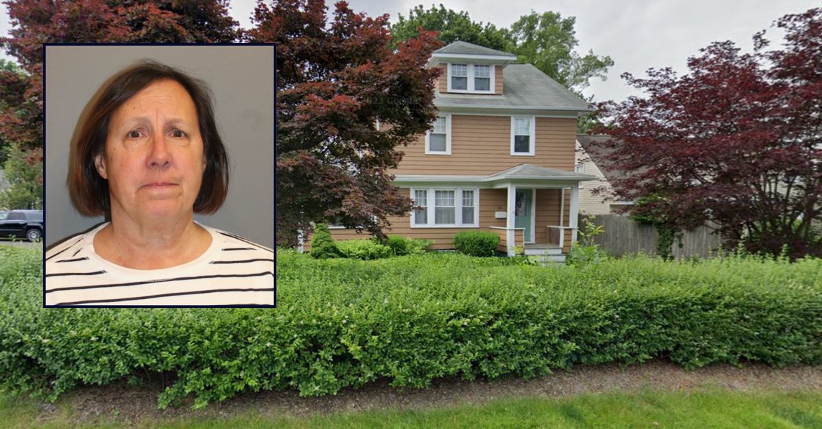 Inset: Ellen Wink (Norwalk Police Department). Background: The house where Wink shot and killed her tenant (Google Maps).