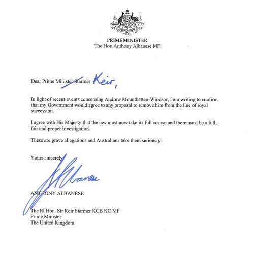 “In light of recent events concerning Andrew Mountbatten-Windsor, I am writing to confirm that my Government would agree to any proposal to remove him from the line of royal succession,” Albanese wrote.