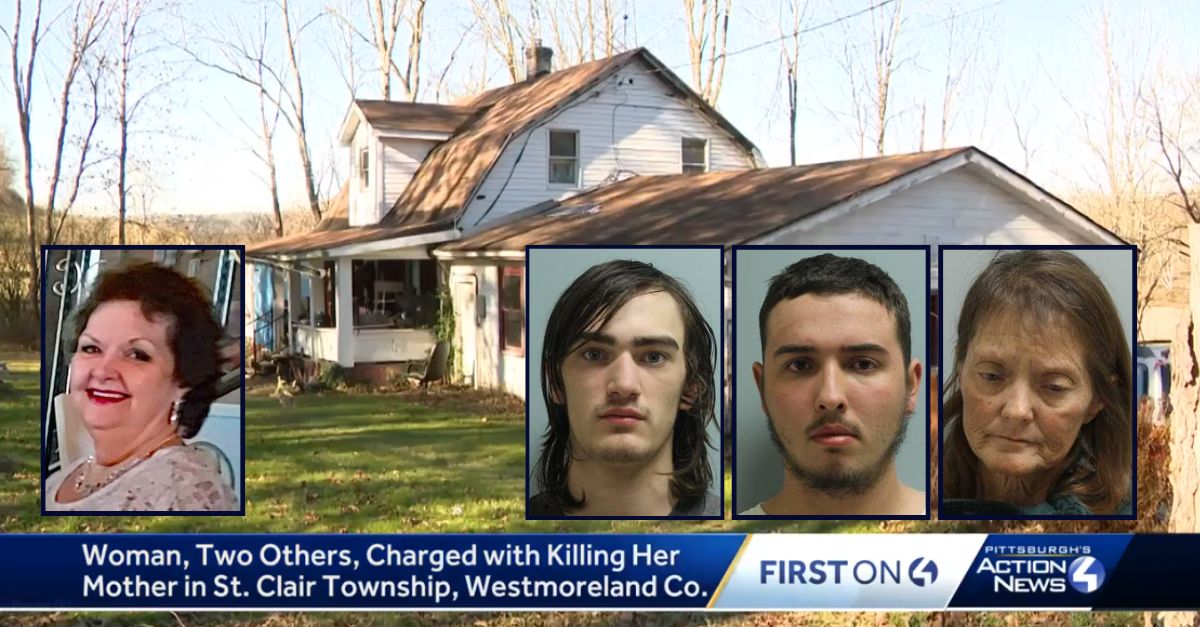 Insets, from left: Alice Robson (Stuart Funeral Home), Melissa Beacom, Robert Jack and Matthew Bates (Westmoreland County Prison). Background: Cops investigate Robson”s death at her home in St. Clair Township, Pennsylvania (WTAE/YouTube).