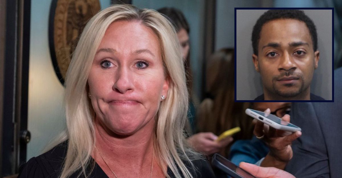 Main: Rep. Marjorie Taylor Greene arrives on Capitol Hill in Washington on Oct. 24, 2023. (AP Photo/Alex Brandon). Inset: Garry Lebron Hayes (Hamilton County Jail).