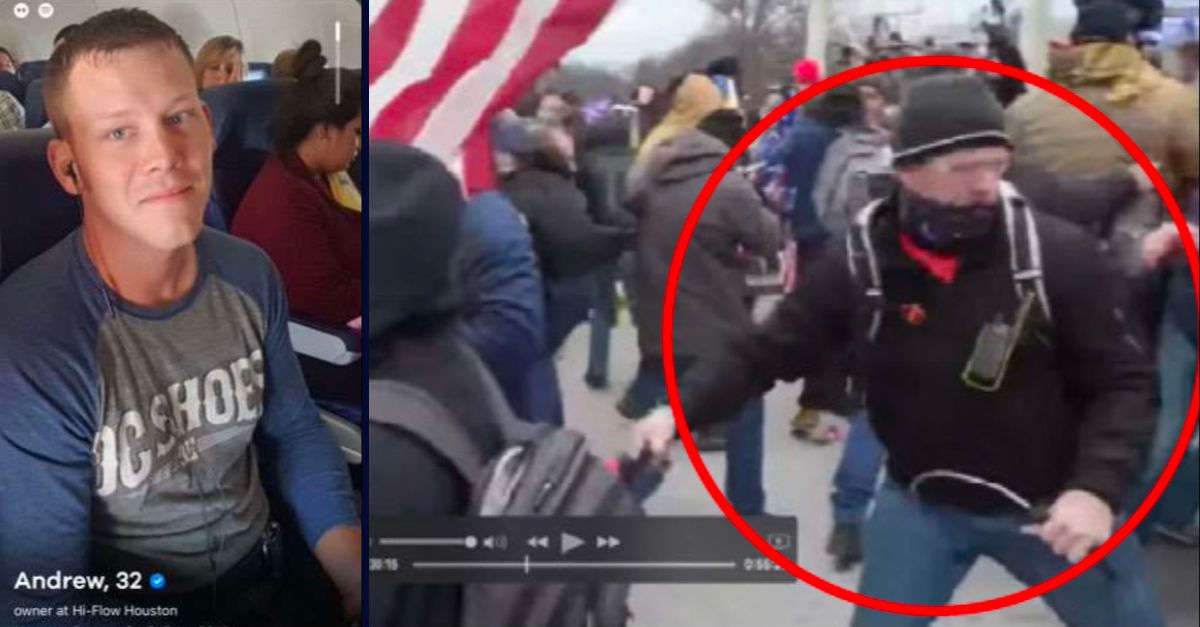 Left: Andrew Taake. Right: Taake seen holding a whip during a confrontation at the U.S. Capitol on Jan. 6, 2021 (via FBI court filing).