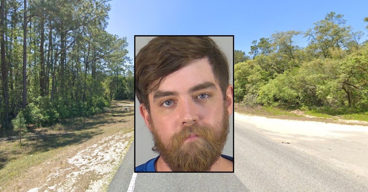Inset: Isaiah MacDonald (Lake County Sheriff’s Office). Background: The region near Buckhorn Road and 445A in Lake County, Florida, where Isaiah MacDonald is accused of attempting to hit an old childhood friend with his vehicle (Google Maps).