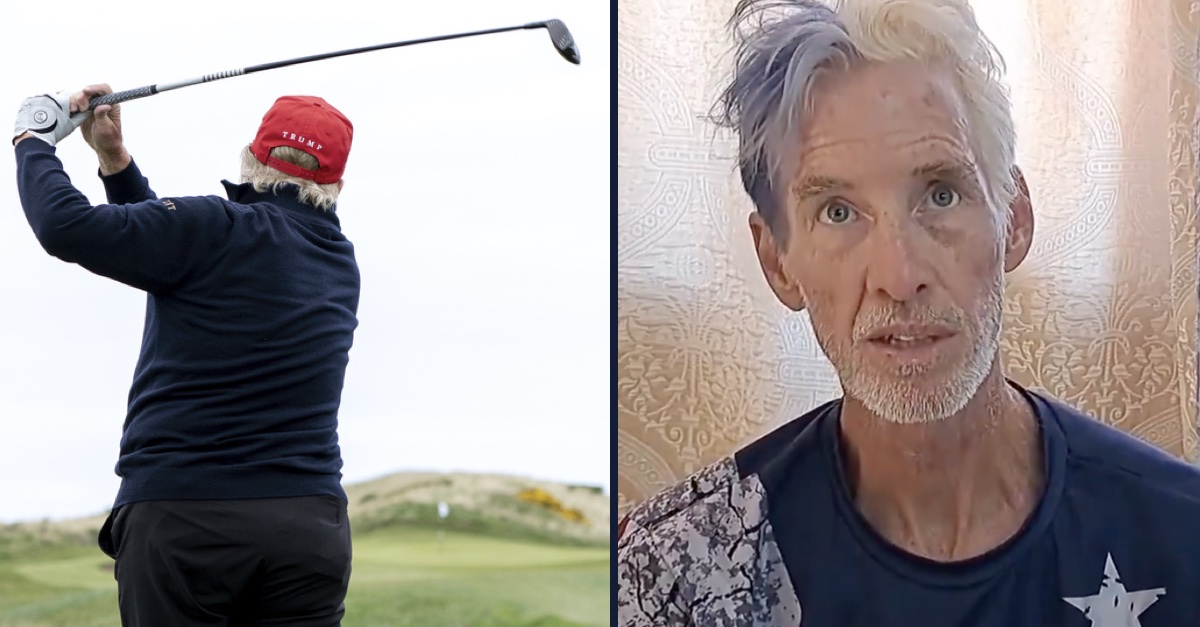 Left: Donald Trump playing golf at the Turnberry course during his UK visit in May 2023. 71992040 (Press Association via AP Images). Right: Ryan Routh discusses his activities in Ukraine (Newsweek Romania).