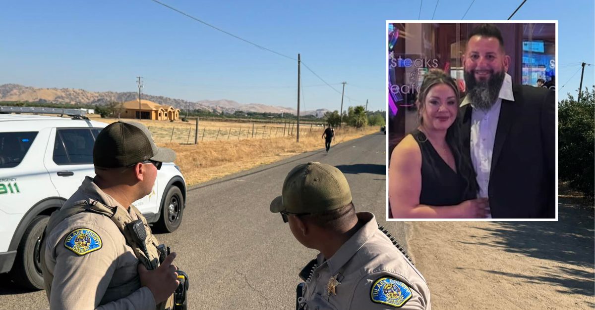 Background: Tulare County Sheriff’s Office deputies sealed off the street where they reportedly engaged in a shootout with Michael Rocha, resulting in his demise (Tulare County Sheriff’s Office). Inset: Yesennia Rocha and Michael Rocha (KFSN).