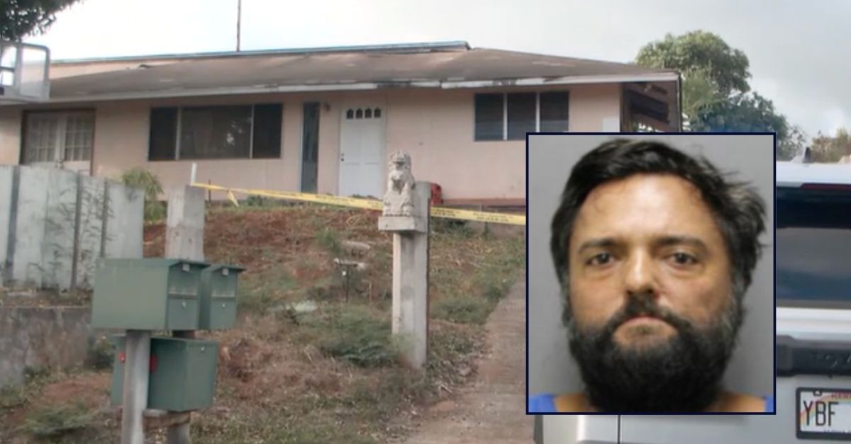 Inset: Frank Bright (Honolulu Police Department). Background: The Honolulu residence where Frank Bright is accused of using a tomahawk to murder his wife Aimee Takaki-Bright (KHNL/YouTube).