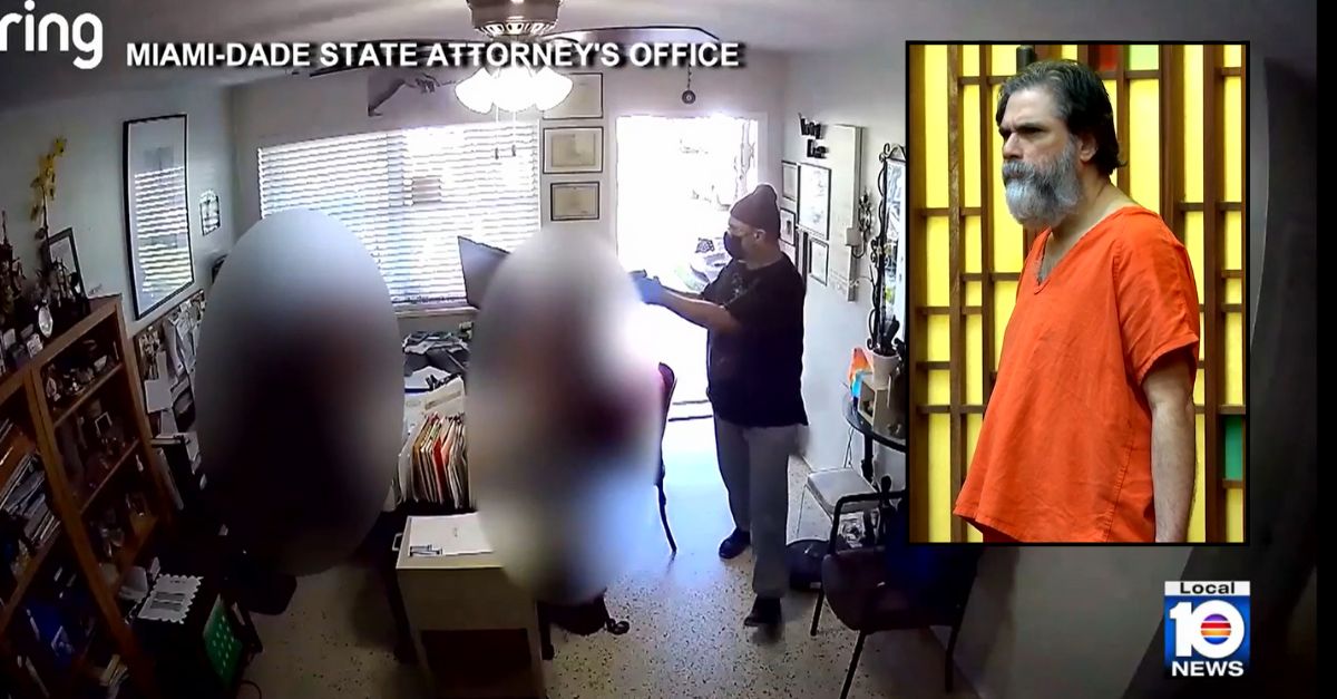 Background: A surveillance video from the workplace of Beatriz Linares-Calamita is purportedly showing Pedro Linares (far right) pointing a firearm at her (Miami-Dade State’s Attorney’s Office via WPLG). Inset: Pedro Linares in court (WPLG).