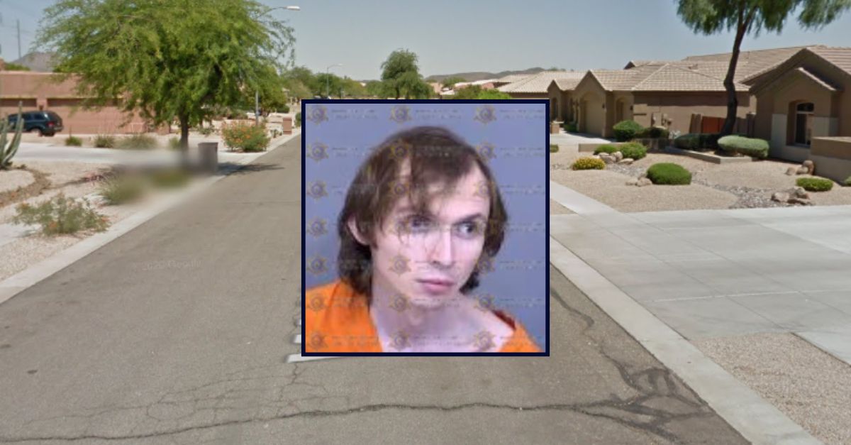 Inset: Zachary Parker (Maricopa County Jail via KPHO). Background: Hatfield Road in Peoria, Arizona (Google Maps).