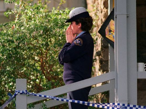 A policewoman on the steps of the Broad Arrow Cafe in Tasmania, the site of the Port Arthur shooting by Martin Bryant on April 28, 1996. (Nine)