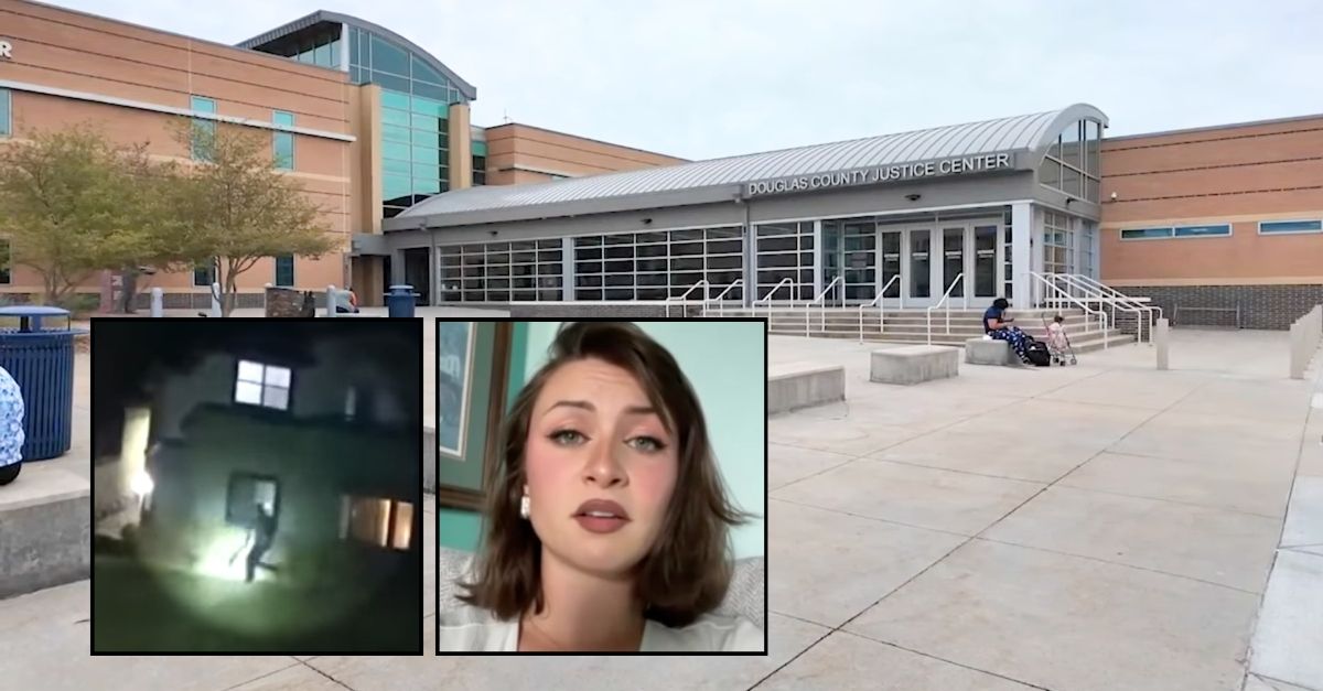 Left inset: Body camera footage shows Taylor Burrows being chased by Colorado police outside Aubrey Cadwell’s residence in Highlands Ranch (23rd Judicial District/KDVR). Right inset: Aubrey Cadwell (KDVR/YouTube). Background: The Douglas County Justice Center in Colorado, the location where Taylor Burrows was sentenced last week to probation instead of imprisonment (KDVR/YouTube).