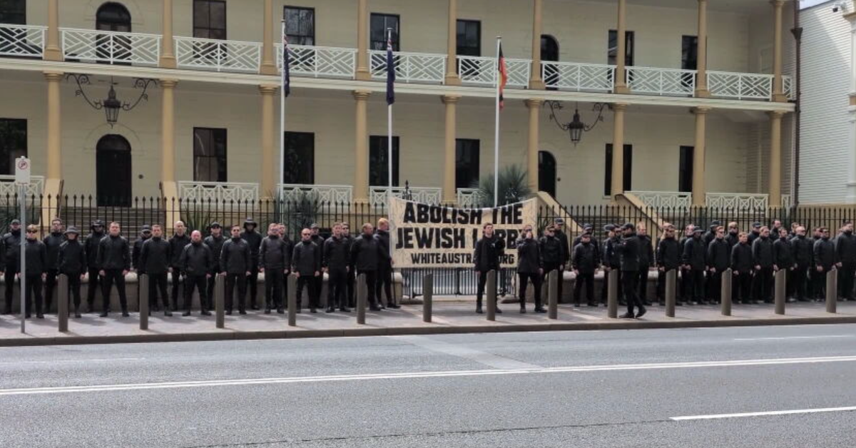 On Saturday, numerous members of the neo-Nazi group National Socialist Network, dressed in black, assembled outside Parliament House to take a photograph with a banner that read, “abolish the Jewish lobby.”