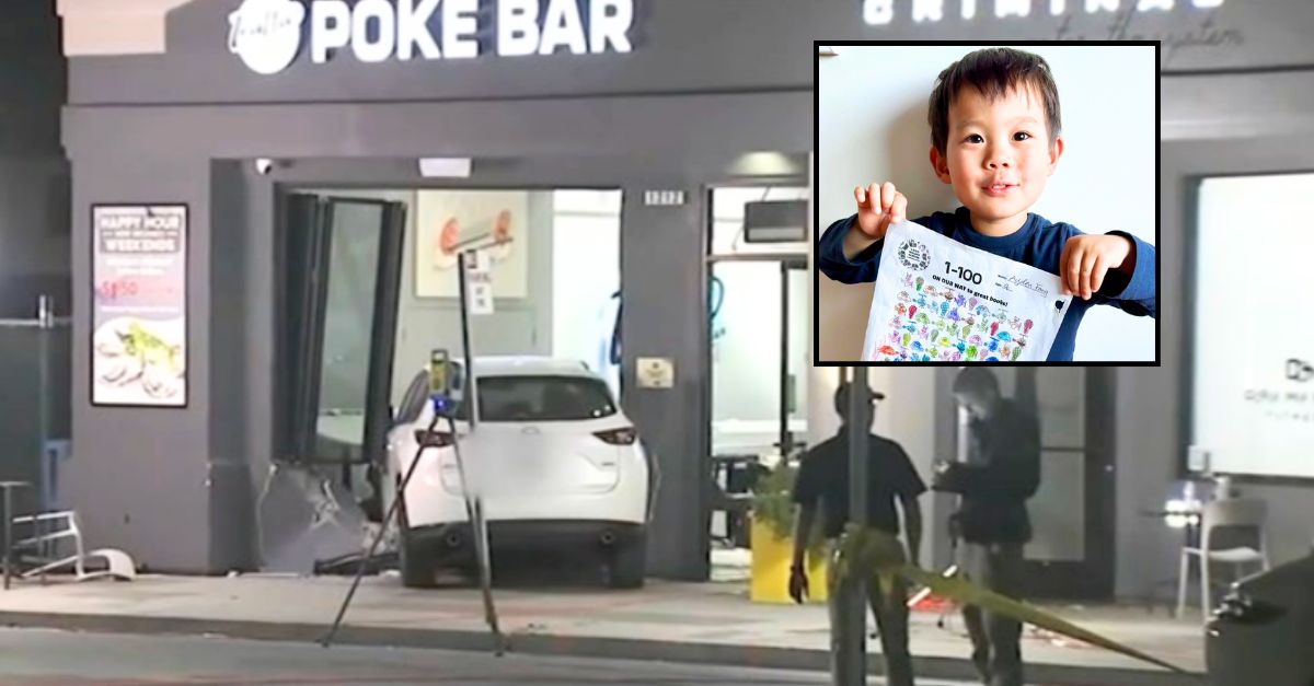 Background: Authorities investigate after a vehicle crashed into 4-year-old Ayden Fang and a poke bar restaurant in Burlingame, California (Cotchett, Pitre & McCarthy Complaint). Inset: Ayden Fang (Cotchett, Pitre & McCarthy Complaint).