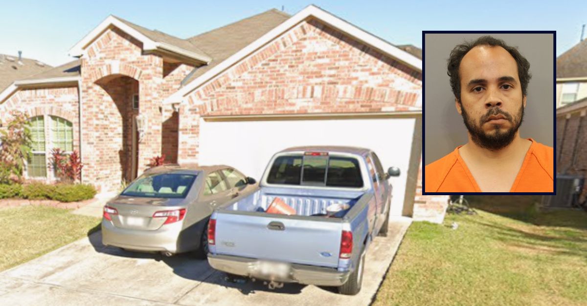 Inset: Gerren Miles Crosson (Houston Police Department). Background: Home in the 11000 block of Harristown Drive in Houston, Texas, where Crosson allegedly stabbed his mother to death (Google Maps).