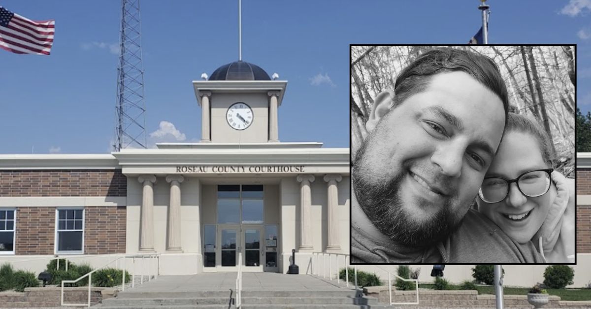 Background: Roseau County Courthouse in Roseau, Minn. (Google Maps). Inset: Theodore Stewart and Danielle Stewart (Facebook).