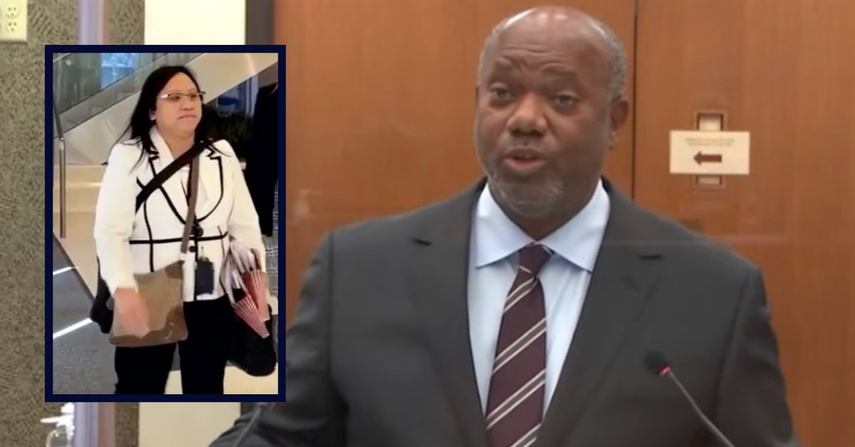 Left inset: Julie Le spotted outside of court on Feb. 3, 2026 (KMSP). Main: U.S. District Judge Jerry Blackwell pictured asking questions of a witness while working as prosecutor during the Derek Chauvin trial (Law&Crime Network).