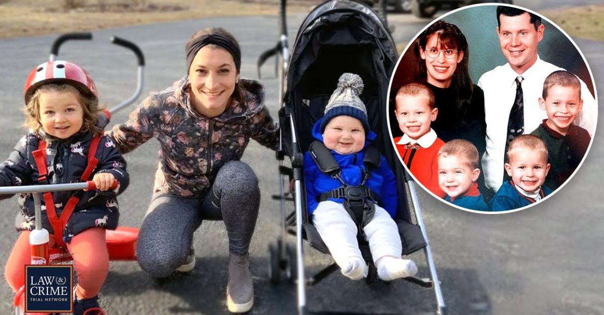 Inset: Lindsay Clancy appears with her full family. Background: Clancy and two of her children (Law&Crime).