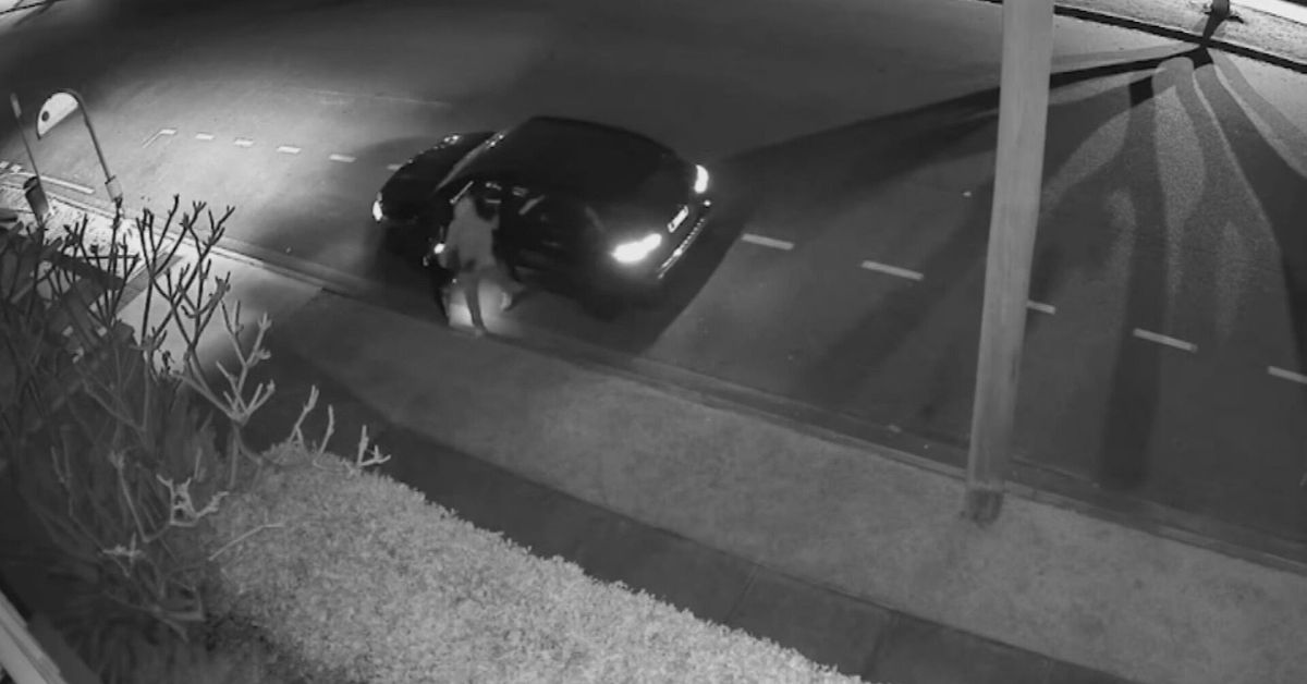 CCTV shows the pair arriving in a small black car before one walks to the front of the property and disables the security gate at the front of the townhouse complex.