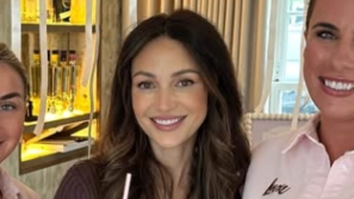 Michelle posed happily with a cocktail in hand while flanked by the bar staff, who were clad in the party theme’s pink and white colours.