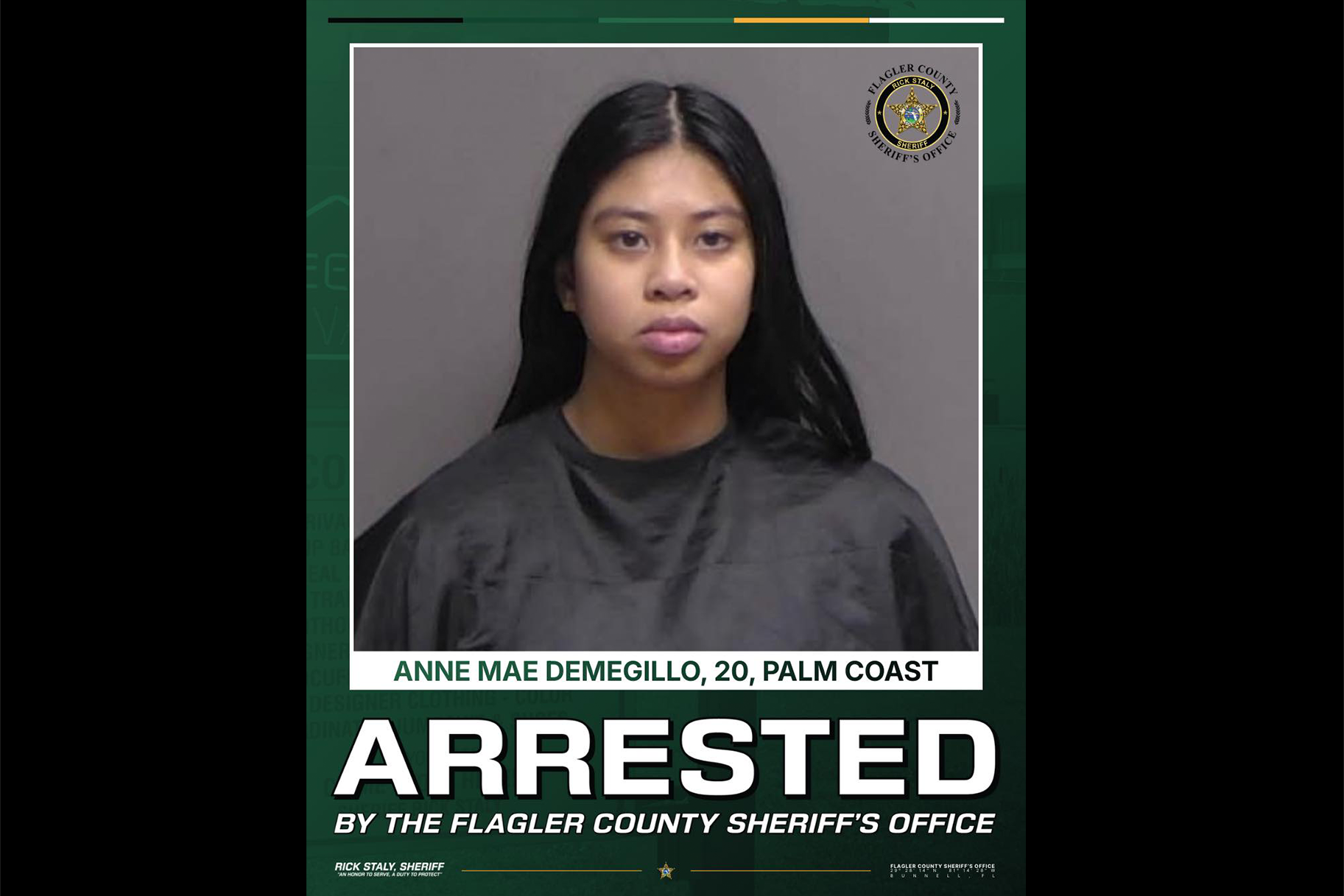 Anne Mae Demegillo was arrested on March 6 and charged with aggravated manslaughter of a child. She is currently held at the Sheriff Perry Hall Inmate Detention Facility in Bunnell.