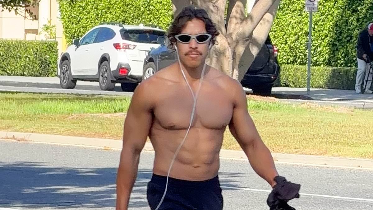 Arnold Schwarzenegger’s youngest son Joseph Baena enjoyed a shirtless stroll through Santa Monica on Sunday in the first sighting since winning big at his first bodybuilding competition