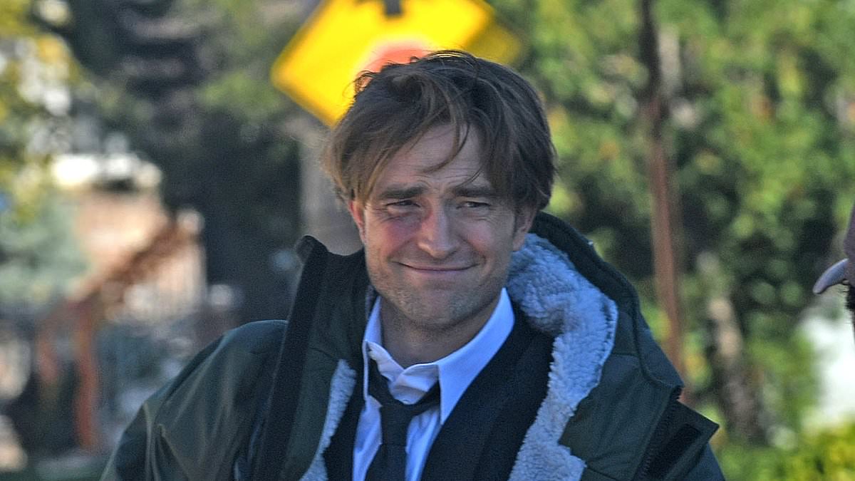 Dressed warmly in a padded coat with a fleece lining, the “Batman” star displayed dark bruising around his right eye, likely special effects makeup for his character.