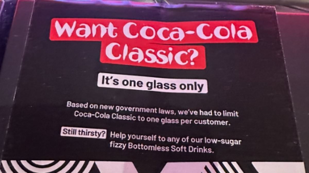 According to the rules, “Due to recent government policies, we’ve had to restrict Coca-Cola Classic to a single glass per patron. Still have a thirst? Opt for our low-sugar fizzy bottomless options instead.”