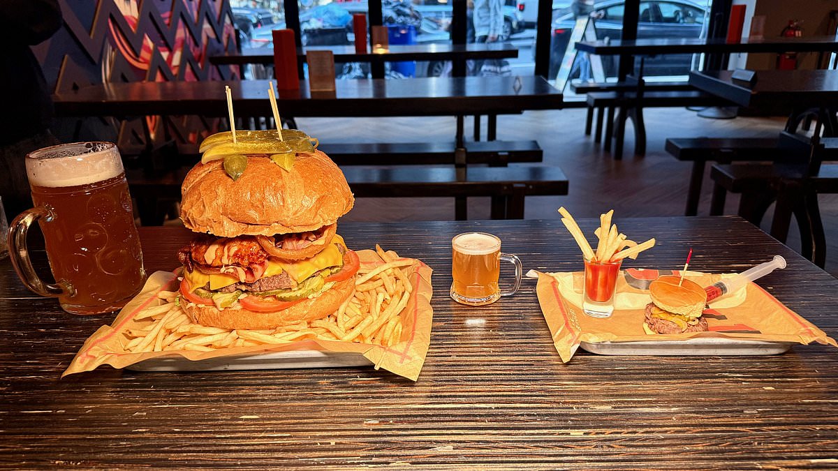 Clinton Hall serves the meal, which is more like the size of a slider than a full-size burger, with a shot glass of fries and a syringe of ketchup