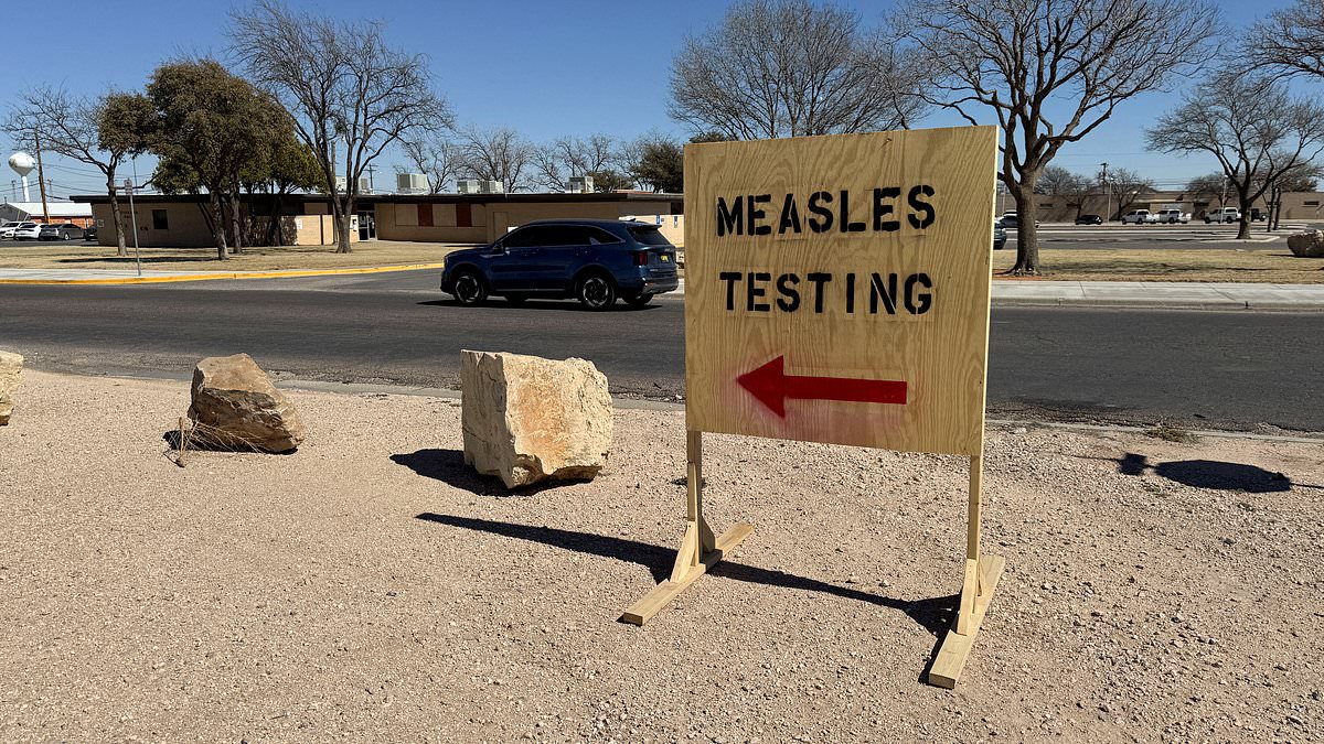 A sign reading ‘measles testing’ is seen as an outbreak in Gaines County, Texas, has raised concerns over the disease’s spread in February 2025