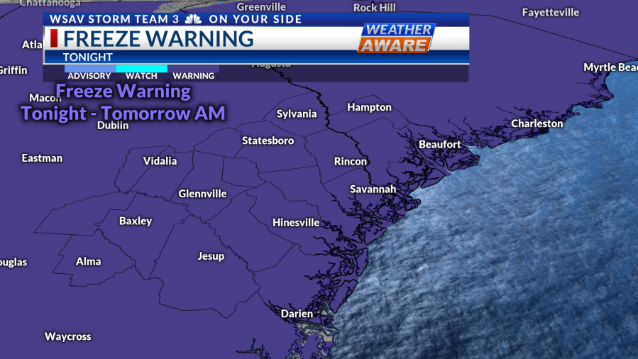Tonight promises to be even chillier, courtesy of the cold front that swept through yesterday. Temperatures are expected to plummet into the upper 20s, with wind chill values potentially dipping into the teens in certain areas. A Freeze Warning is in effect for the entire region from tonight through tomorrow morning. Due to the widespread freeze, tomorrow morning has been declared a Weather Aware Day. Allocate extra time to defrost your car before leaving home. Additionally, a Cold Weather Advisory is in place for inland Georgia and South Carolina as wind chill values are projected to fall into the teens and 20s.