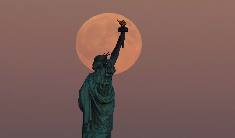 The Harvest Supermoon rises behind the Statue of Liberty in New York City as the sun sets on October 6, 2025 as seen from Jersey City, New Jersey. (Photo by Gary Hershorn/Getty Images)