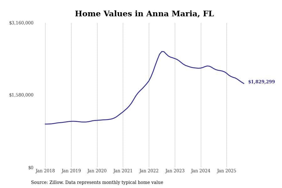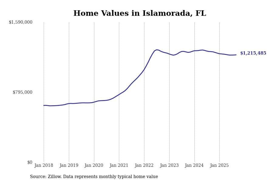 Returning to Key West, another home value is noted at $1,052,678, reflecting a 5.2% decline over the last year and an impressive 63.0% increase in the past five years.