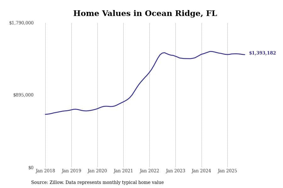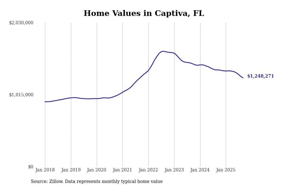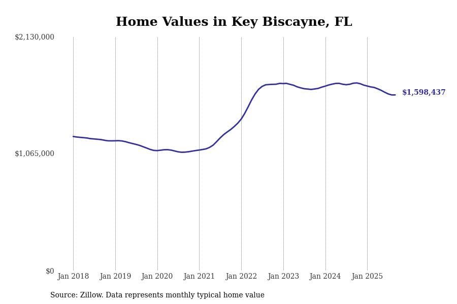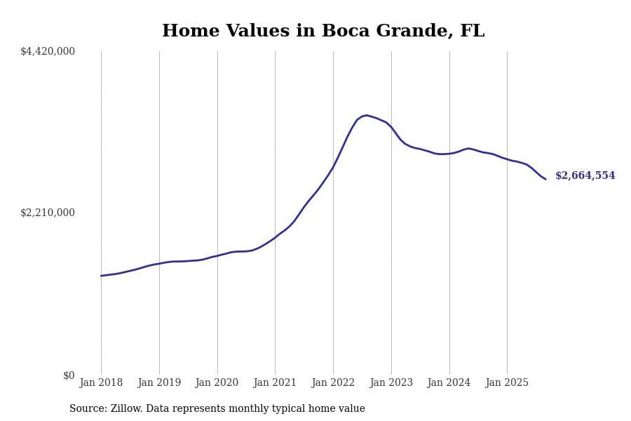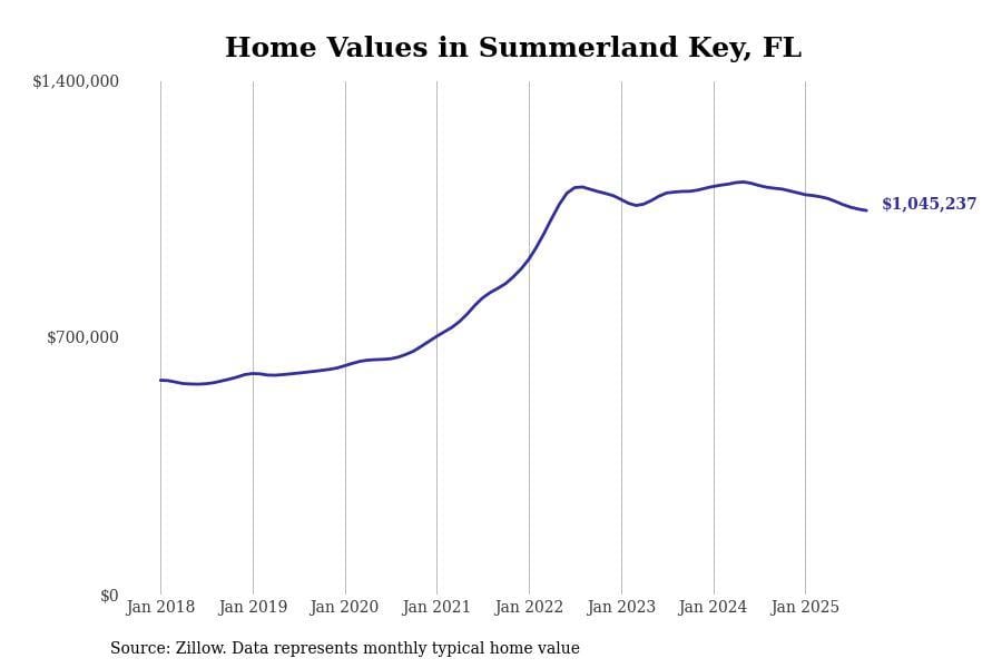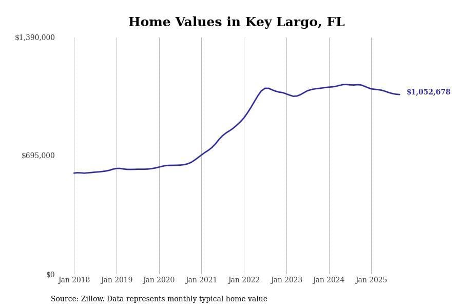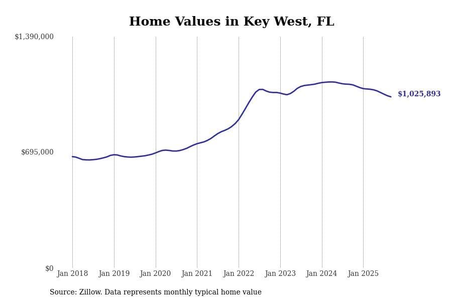 In Key West, the typical home value stands at $1,025,893. Over the past year, home prices have decreased by 6.8%, although there’s been a significant rise of 44.6% over the last five years.
