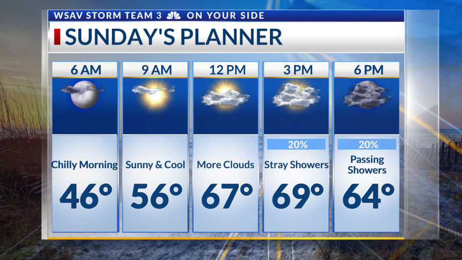 SAVANNAH, Ga. — Prepare for another brisk evening as we head into Sunday morning, with minimal chances of rain to wrap up the weekend.