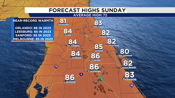 However, don’t get too settled—the weather is set for a change. This weekend will continue to bask in warmth, with temperatures reaching the 80s. Sunday could see near-record highs, with Orlando predicted to hit 86°F, matching last year’s record. Many other locations might also approach record temperatures, making it a perfect weekend for outdoor activities under the sun.