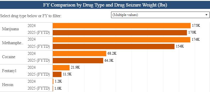 Fentanyl seizures – just like migrant encounters – fell drastically during fiscal year 2025, according to data from CBP.