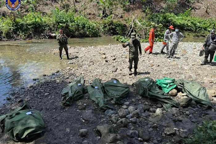 In this photo provided by the Philippine Air Force, Philippine Air Force personnel retrieve the remains of the pilots and crew of the Super Huey helicopter on Wednesday, Nov. 5, 2025, a day after it crashed in Agusan del Sur province, southern Philippines while on a humanitarian and disaster response mission due to Typhoon Kalmaegi. (Philippine Air Force via AP)