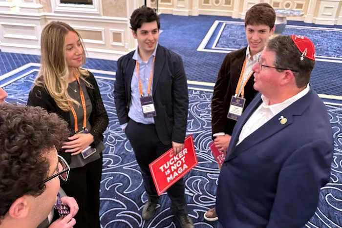 Perhaps that is why dozens of college-age Jewish Republicans attended the conference, cheekily waving red signs emblazoned with “Tucker is not MAGA,” a reference to President Donald Trump’s Make-America-Great-Again mantra, during Florida Congressman Randy Fine’s presentation.