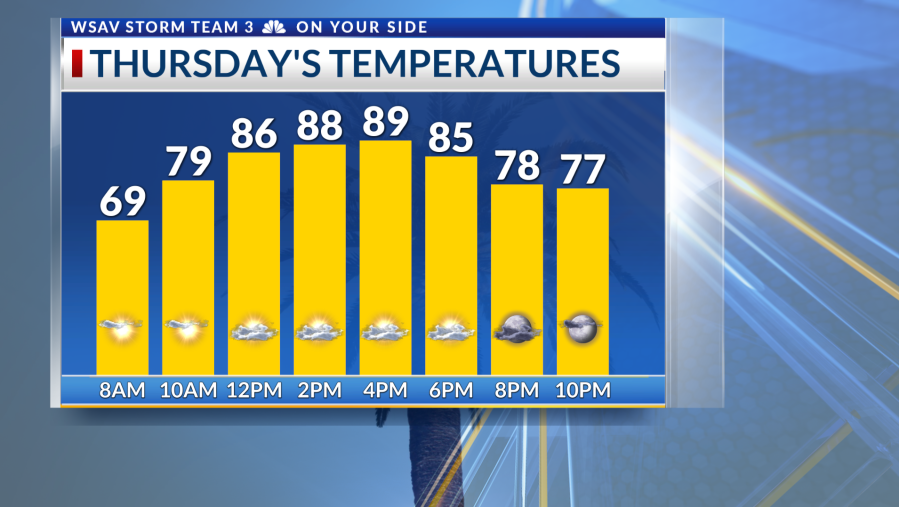 On Thursday morning, temperatures are expected to begin in the mid-60s inland and around 70 near the coast. The skies will start off partly cloudy and clear up more overnight.