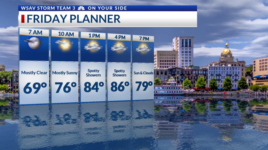 Friday will begin with mostly clear skies after sunset, with temperatures in the 60s inland and lower 70s along the coast. By the afternoon, temperatures are expected to rise into the mid to upper 80s.