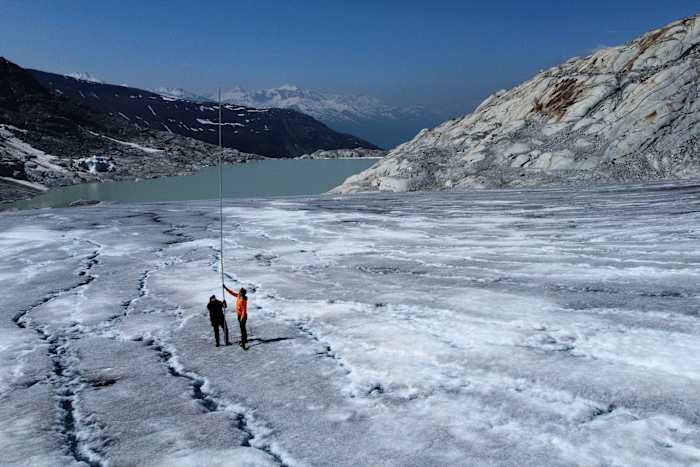 “We have a network of stakes that are drilled into the ice where we determine the melting of the mass loss of the glacier from year to year,” he said. “When the glacier will be melting, which is at the moment a speed of about 5 to 10 centimeters (2-4 inches) a day, this pole will re-emerge.”