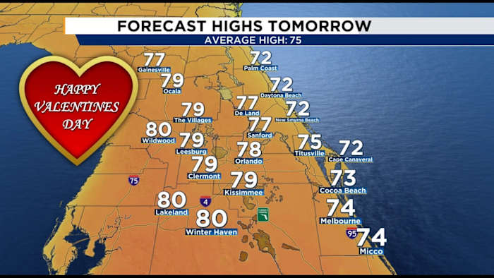 Valentine’s Day promises to be mostly dry and pleasantly warm, setting the stage for a delightful day. Inland temperatures will climb to the upper 70s, potentially reaching near 80 degrees, while coastal areas will enjoy milder conditions with highs in the mid to upper 70s. Although a brief, isolated shower might develop near the coast, particularly from Cape Canaveral southward, the majority of the region is expected to stay rain-free.