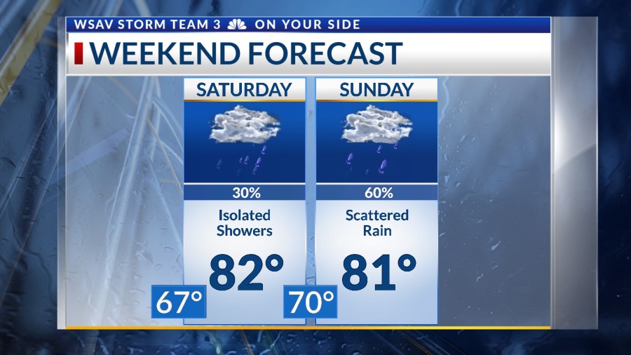 A mid-level disturbance will cause a slight wind shift and add more moisture by the end of the weekend. There’s a 60% chance of rain on Sunday and Monday, with periods of soaking rain possible. Most rain will fall south of I-16, though the Lowcountry may experience occasional showers.