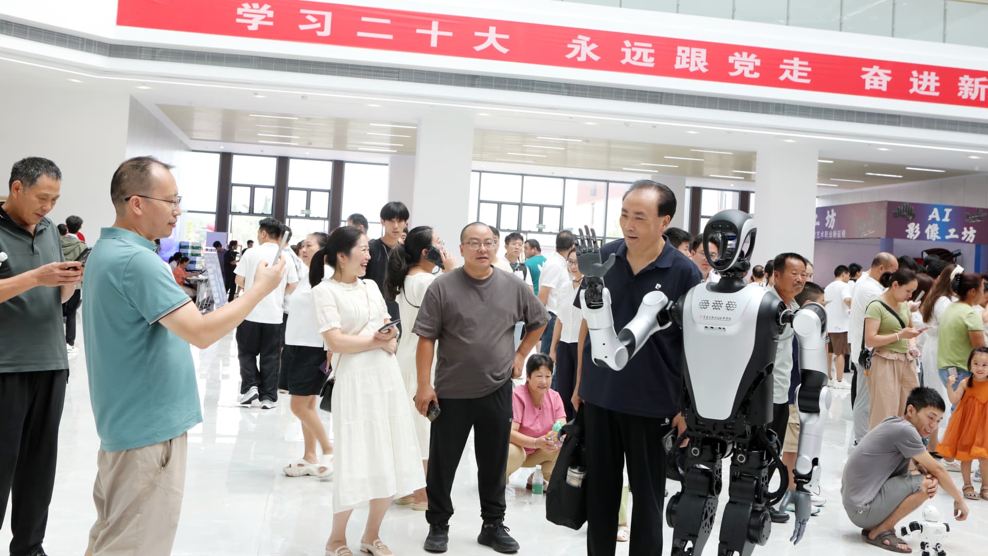 Students and parents take a photo with the “AI Intelligent Professor” humanoid robot on Aug. 30, 2025, at the Chongqing Intelligent Engineering Vocational College.