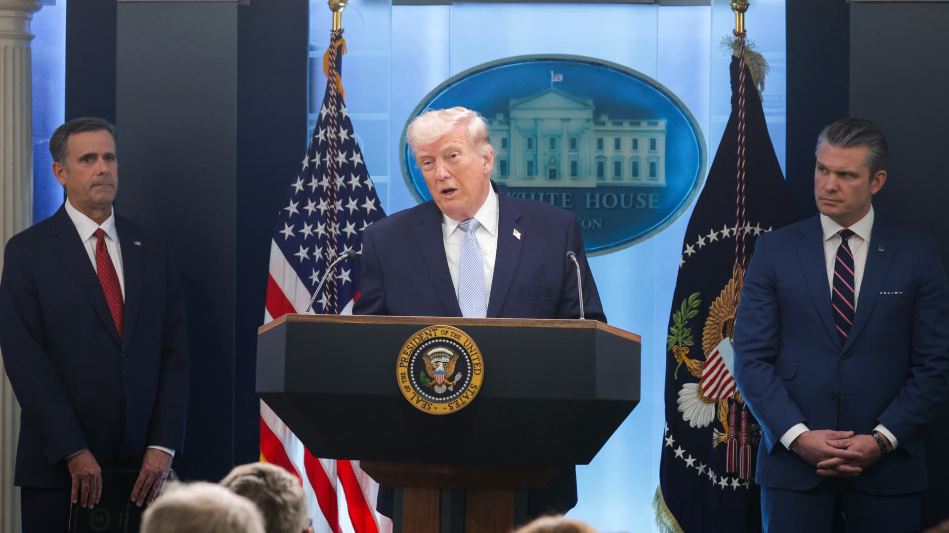 WASHINGTON, DC – APRIL 06: During a news conference held in the James S. Brady Press Briefing Room at the White House, President Donald Trump addressed the nation. He was flanked by Central Intelligence Agency Director John Ratcliffe on his left and U.S. Secretary of War Pete Hegseth on his right. The event took place on April 6, 2026, in Washington, DC.