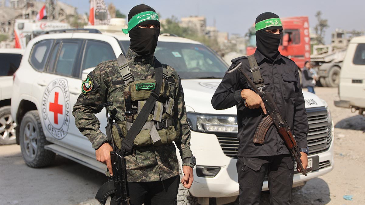 Palestinian Hamas militants stand near a International Red Cross (ICRC) vehicle, as a search for the bodies of killed Israeli hostages takes place, in Gaza City on November 2, 2025