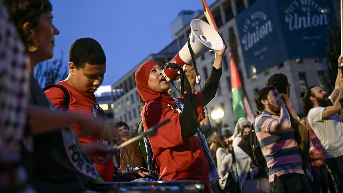 Protesters shout slogans against the visit to the US of Israel Prime Minister Benjamin Netanyahu at Lafayette Square in Washington, DC, on September 29