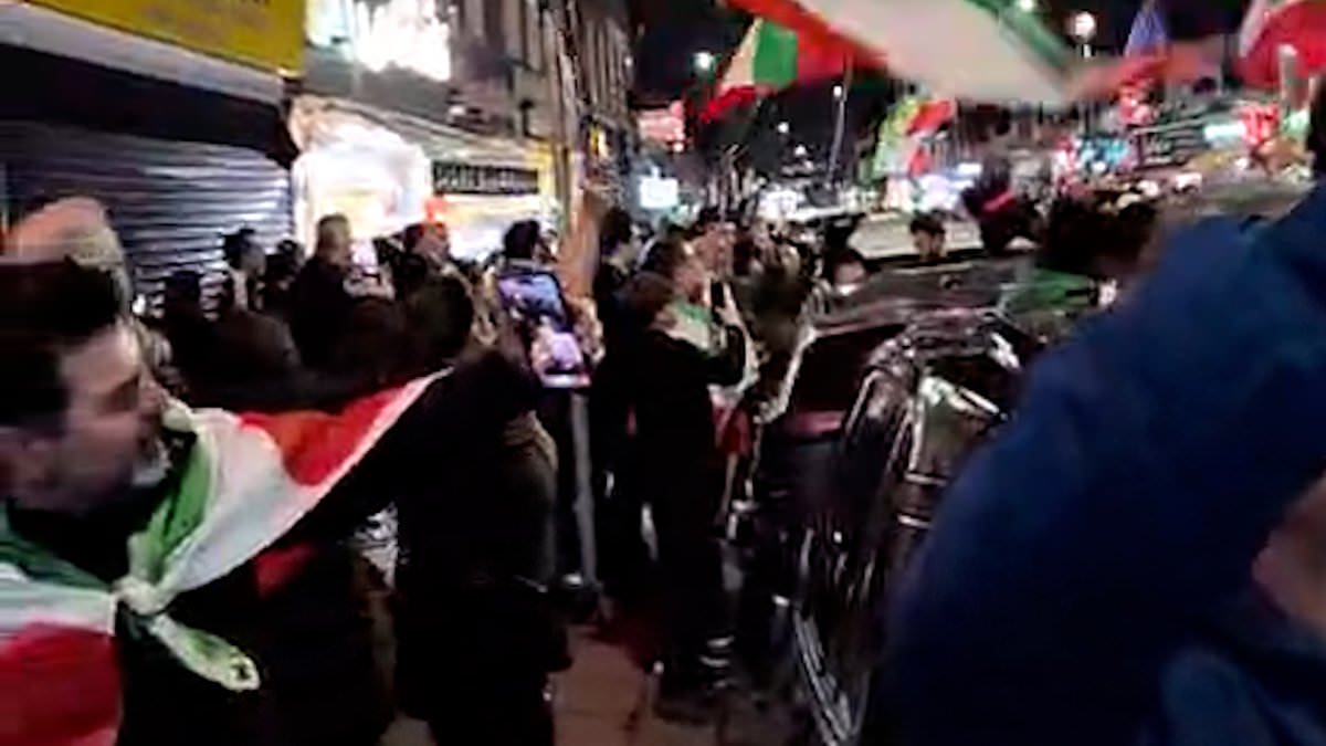 On a Saturday evening in North London, a street was transformed into a lively scene as a large group of Iranians gathered to celebrate, following an announcement from Donald Trump regarding the death of Ayatollah Ali Khamenei.